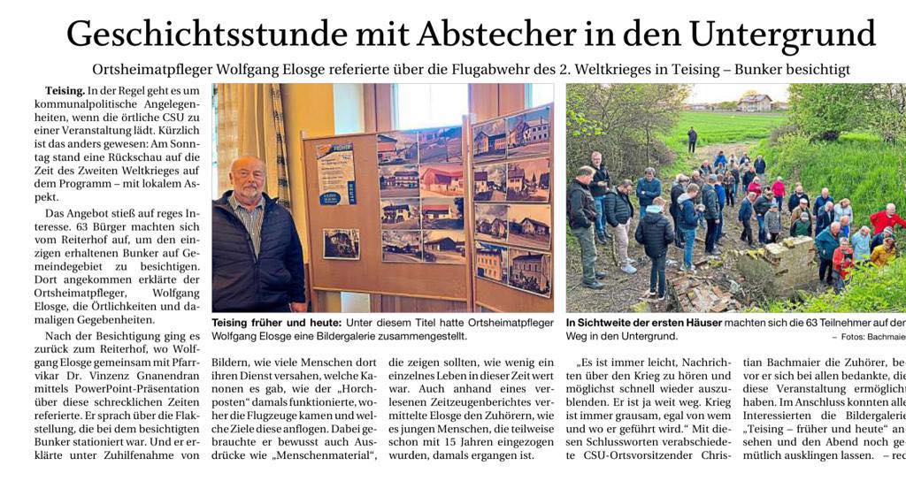 Insgesamt war der Vortrag von Wolfgang Elosge ein großer Erfolg. Die vielen Besucher waren begeistert von seiner Expertise und seinem Engagement für die Geschichte von Teising. Es ist zu hoffen, dass der CSU- Ortsverband Teising in Zukunft weitere solcher Veranstaltungen organisieren wird, die das Wissen über die Geschichte der Region erweitern und bewahren.